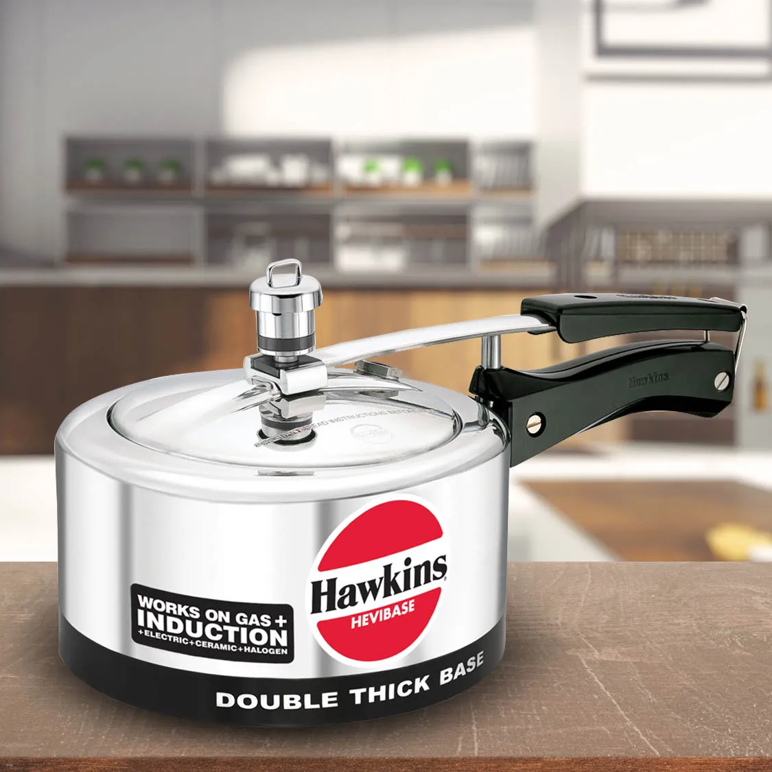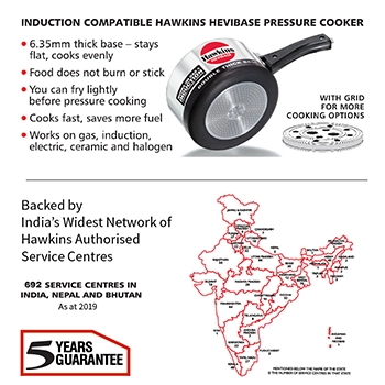 Hawkins Hevibase Pressure Cooker boasts a double-thick 6.35 mm hard-anodized base with an induction-compatible disc, ensuring quick and even heating for optimal cooking. The heavy-gauge base, double-thick and flat, is ideal for light frying before pressure cooking, retaining its shape and strength. Designed with an inside-fitting lid for inherent safety, pressure-locked akin to a jetliner door. Features an advanced pressure regulating system, ensuring precise pressure control, reducing froth formation. The safety valve, strategically located under the lid handle bar, directs steam downward for safe operation. Minimizes exposure of gasket to steam, enhancing durability by avoiding wear and tear during frequent opening and closing. Equipped with stay-cool handles and a fixed sturdy pivot, ensuring prolonged handle life. Suitable for use on all domestic gas, electric, halogen, ceramic, and induction cooktops.
