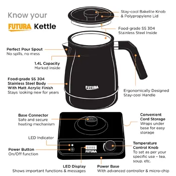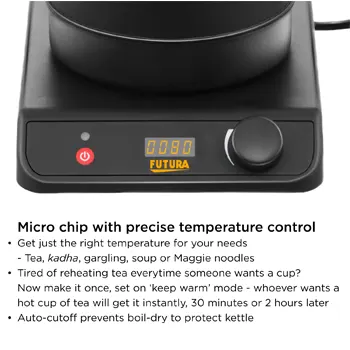 The Futura Electronic Kettle is a smart and convenient way to heat water to the perfect temperature every time. With its built-in temperature display, you can easily monitor the heat of your liquid and avoid scalding your tongue with overly hot tea or coffee. No more waiting for your water to cool down after it’s overheated—this kettle lets you enjoy your beverage at your desired temperature throughout the day. It’s especially ideal for making infusions like Kadha (Decoction), where the water needs to be held at a consistent temperature for maximum flavor and benefits. Powered by a 1200-watt heater, the kettle quickly brings water to your preferred warmth. Constructed with 18/8 food-grade stainless steel, it’s not only durable but also healthy and easy to clean, thanks to its wide mouth design. Enjoy a smarter, more efficient way to heat water with the Futura Electronic Kettle!